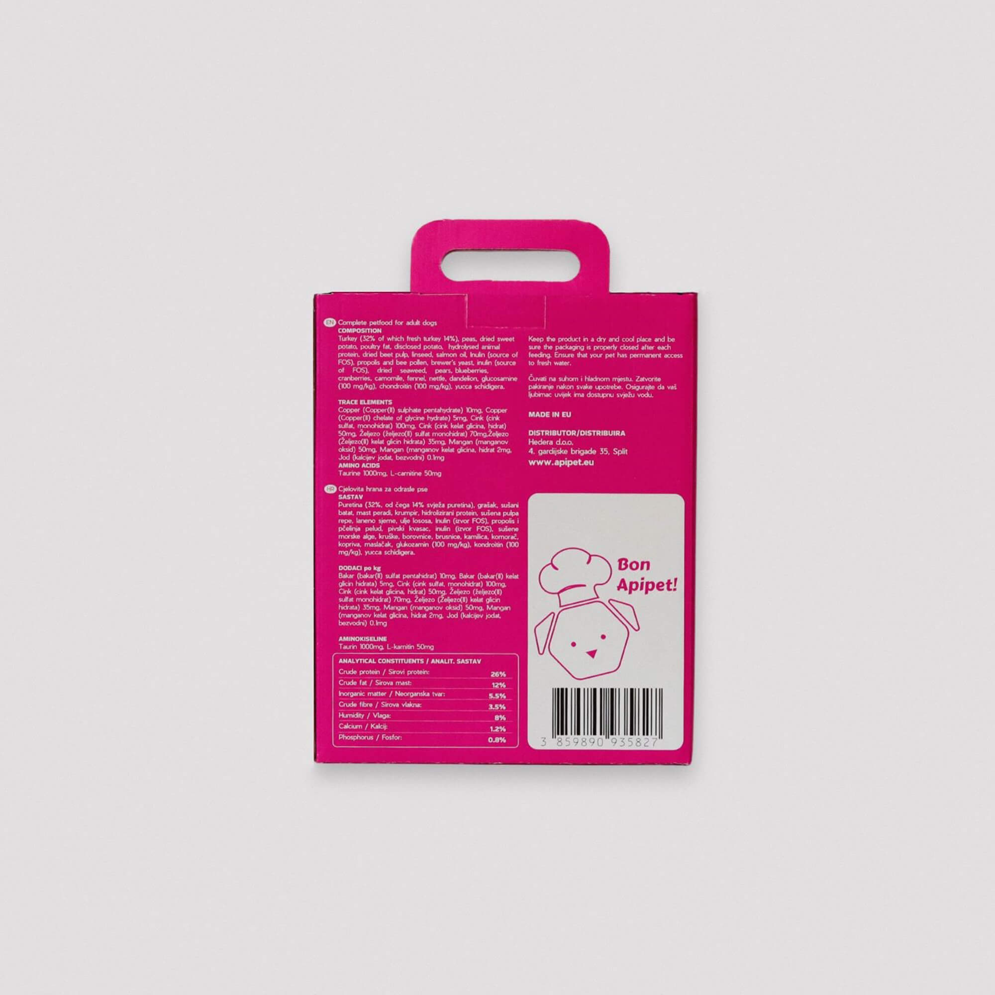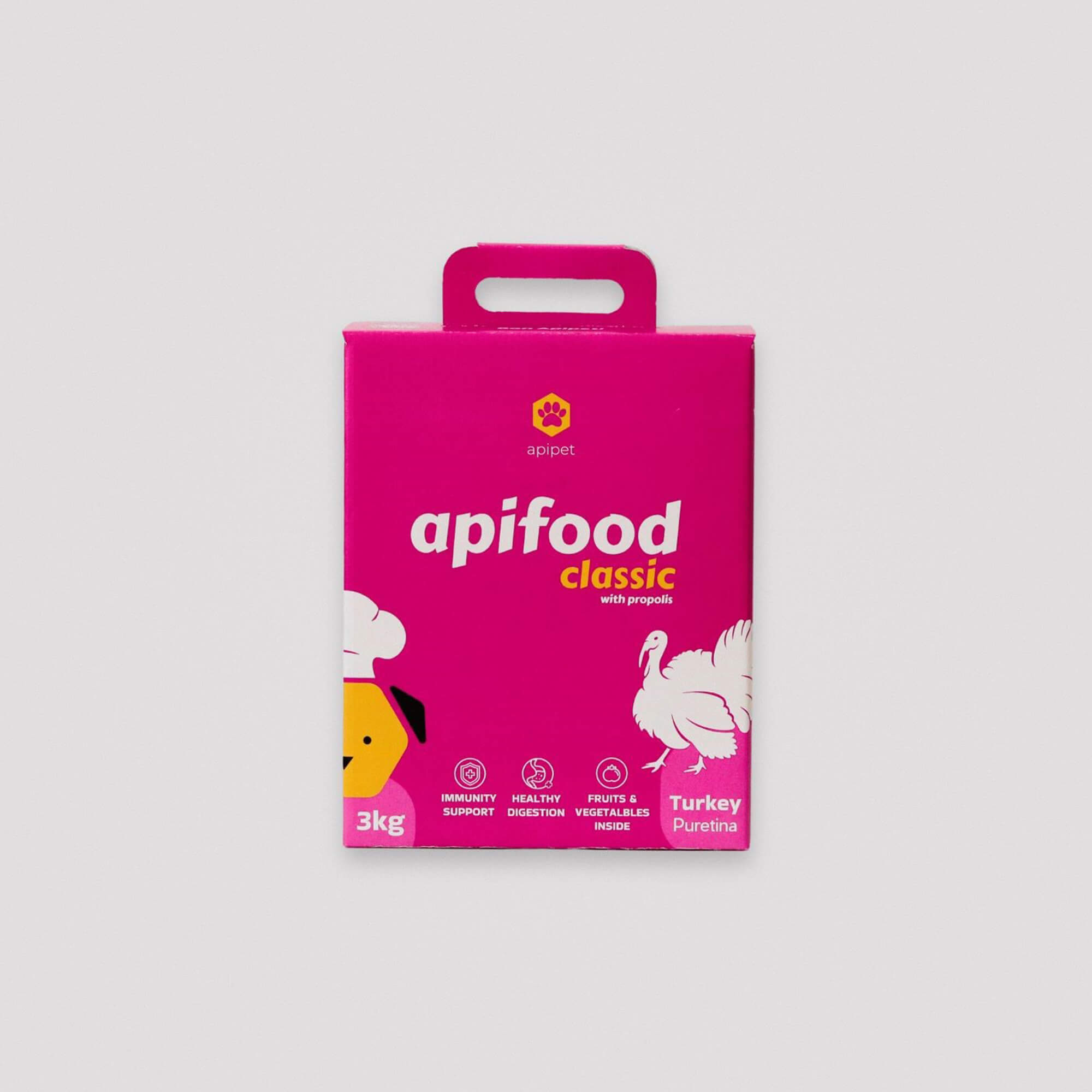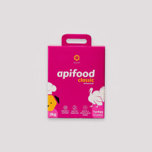 Apifood Classic Puran je super premium hladno stiskana hrana iz puranjega mesa z dodatkom propolisa. Namenjena je vsem odraslim psom od 5 kg naprej. Zaradi posebnega načina priprave je hladno stiskana hrana bogata s hranilnimi snovmi, vitamini in minerali.
