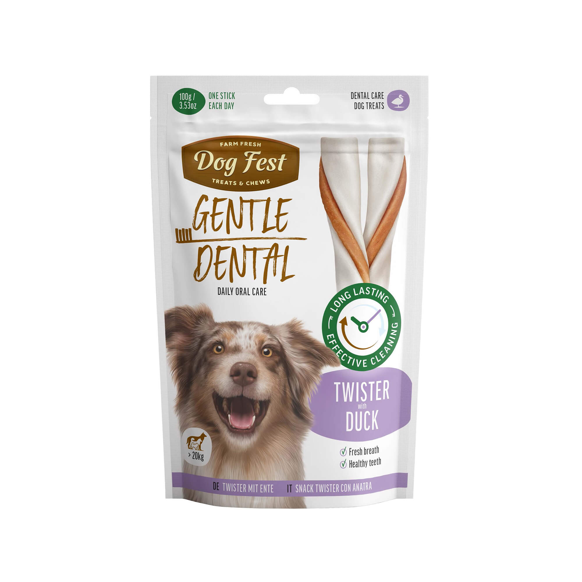 Dog Fest Twister Govedina – okusna in funkcionalna zobna poslastica, posebej prilagojena večjim psom (nad 20 kg). Dental Twister z govedino združuje naravne sestavine in posebno strukturo, ki učinkovito čisti zobe, osveži dah in vašemu psu nudi dolgotrajno zabavo.