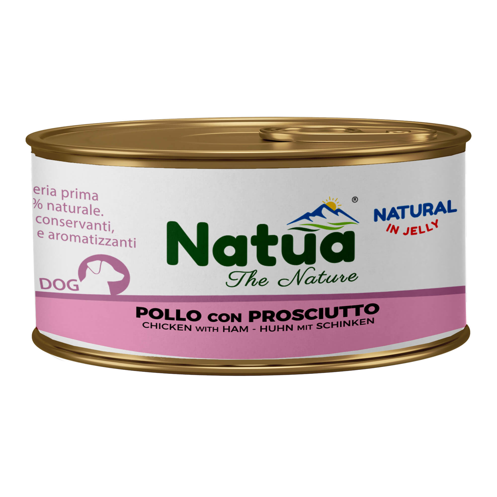 Natua Jelly Dog Piščanec s šunko je v pločevinki 150 g.