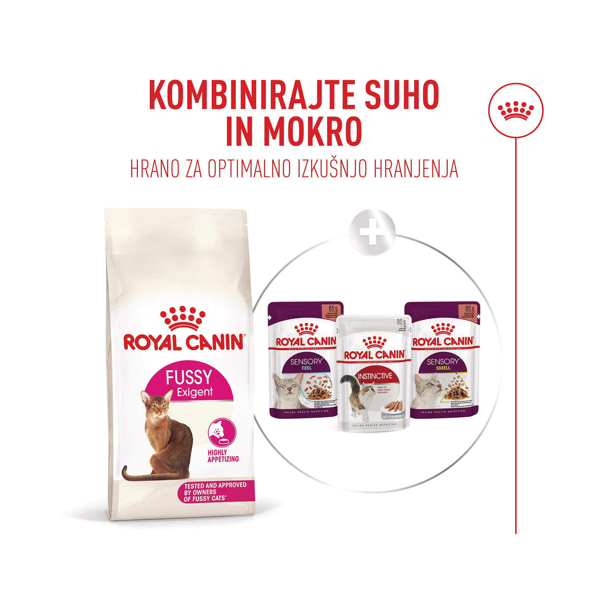 Za še okusnejši obrok izbirčnih jedcev formula hrane Fussy združuje 3 prejšnje hrane Exigent – Savour, Aroma, in Protein – v en sam slasten izdelek: ROYAL CANIN® Fussy.